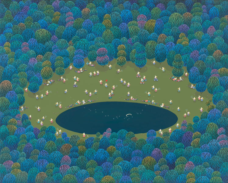 The shape of a "parrot's head" that appears in my works represents the modern-day behavior of mimicking and repeating what others do. It is divided by boundaries like a trapped island. Within these boundaries, I float balloons of hope, fly kites, and depict the world through the innocent eyes of playful children. As always, the string of hope resides within us at this very moment. Like children, we should live not in parts but as a whole, loving abundantly without space for hate.
